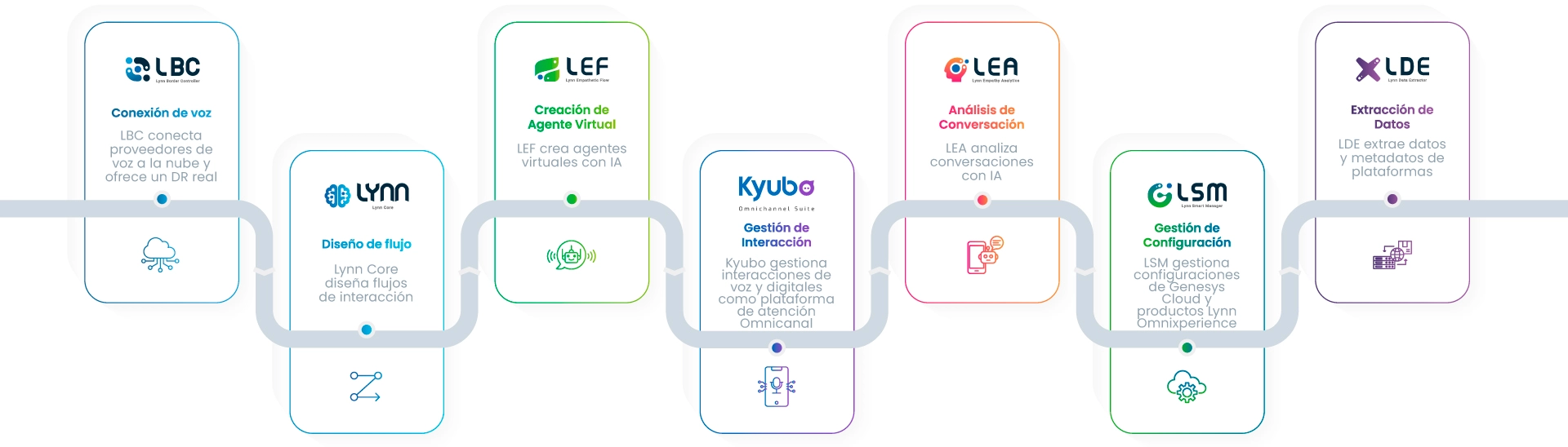 La suite Lynn Omnixperience ofrece una solución completa y flexible para optimizar las interacciones de voz y digitales, desde la conexión inicial hasta el análisis post-interacción. Con sus siete productos interconectados, Lynn Omnixperience permite a las empresas mejorar la eficiencia, la experiencia del cliente y la toma de decisiones basada en datos.