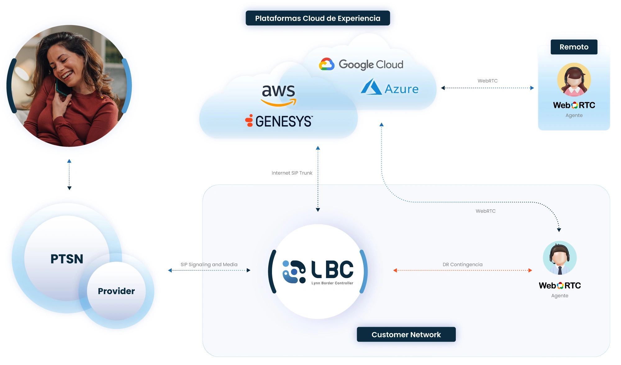 LBC, o Lynn Border Controller, actúa como el puente que conecta la voz con diversas plataformas de experiencia del cliente, como Genesys y Kyubo. Sus capacidades clave incluyen:
