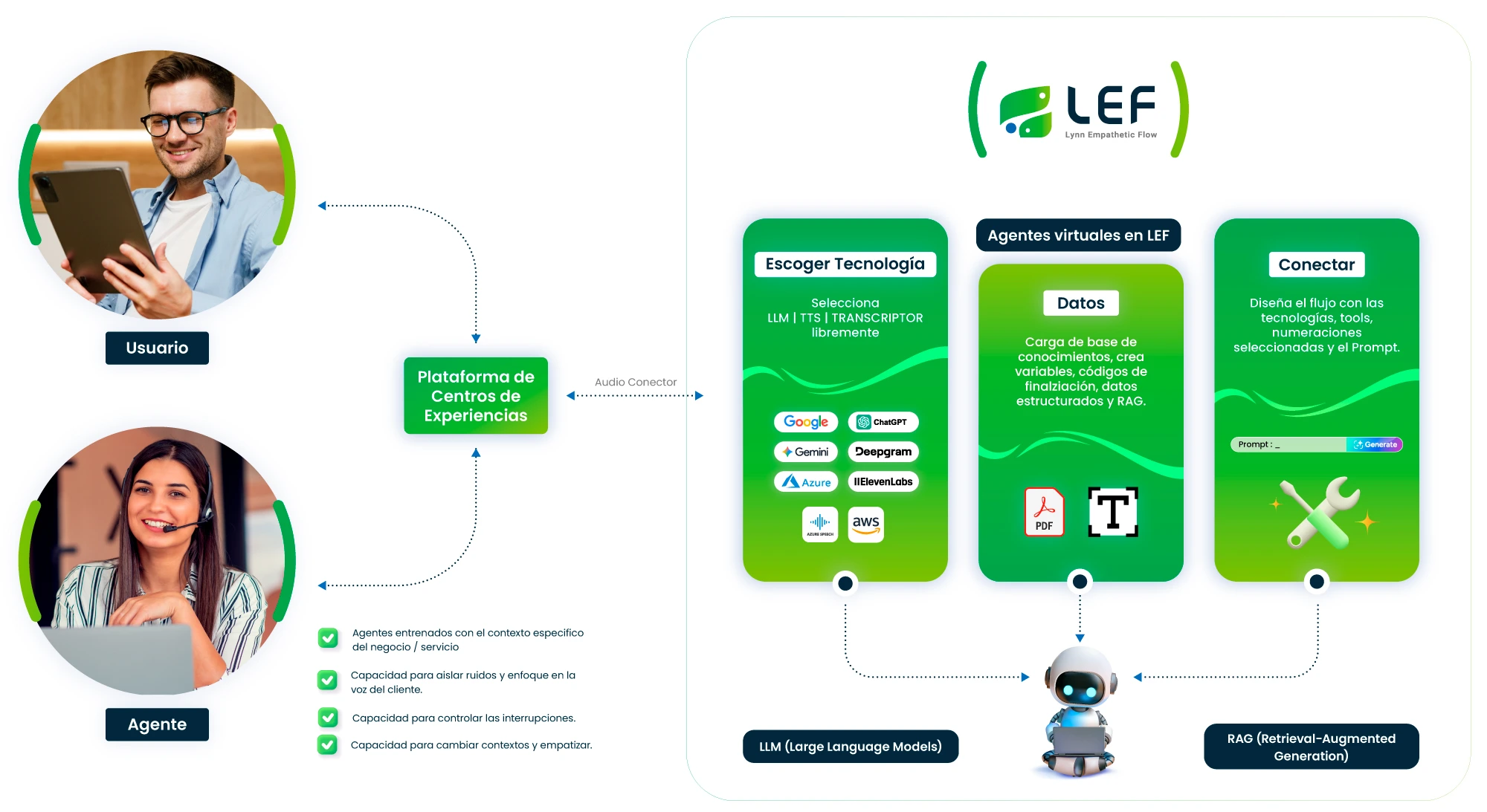 LEF, o Lynn Empathetic Flow, permite a los clientes crear agentes virtuales para automatizar y personalizar las interacciones. Sus características principales son: